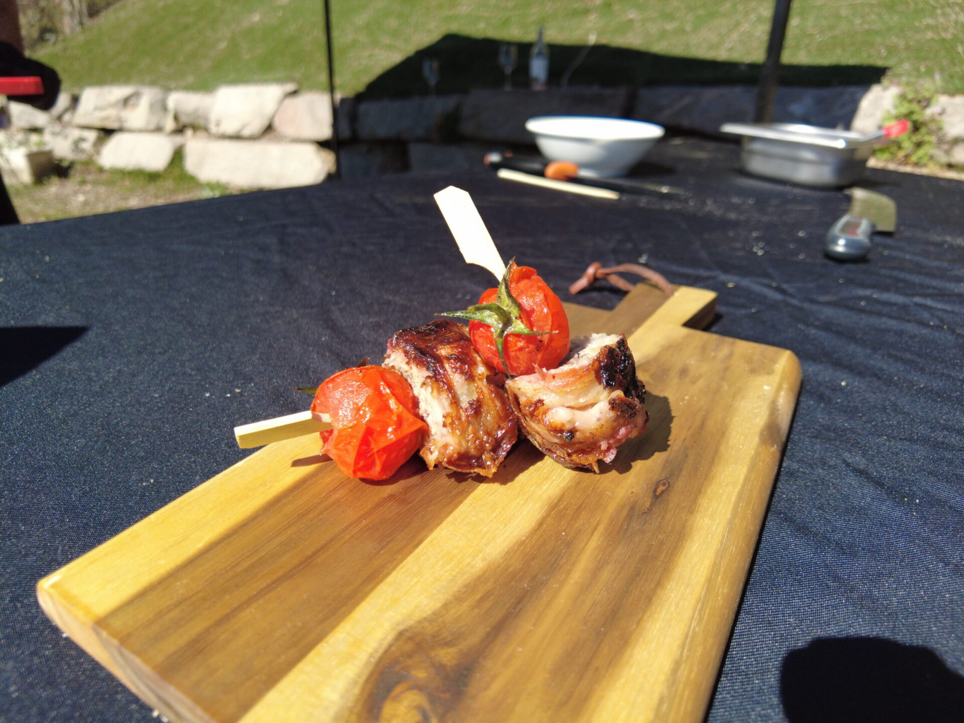 Avvolgere il tutto con la fettina di pancetta, speck o guanciale, infilzare 2 o 3 pezzi in uno spiedino di legno e grigliare in cottura diretta per 10 minuti
