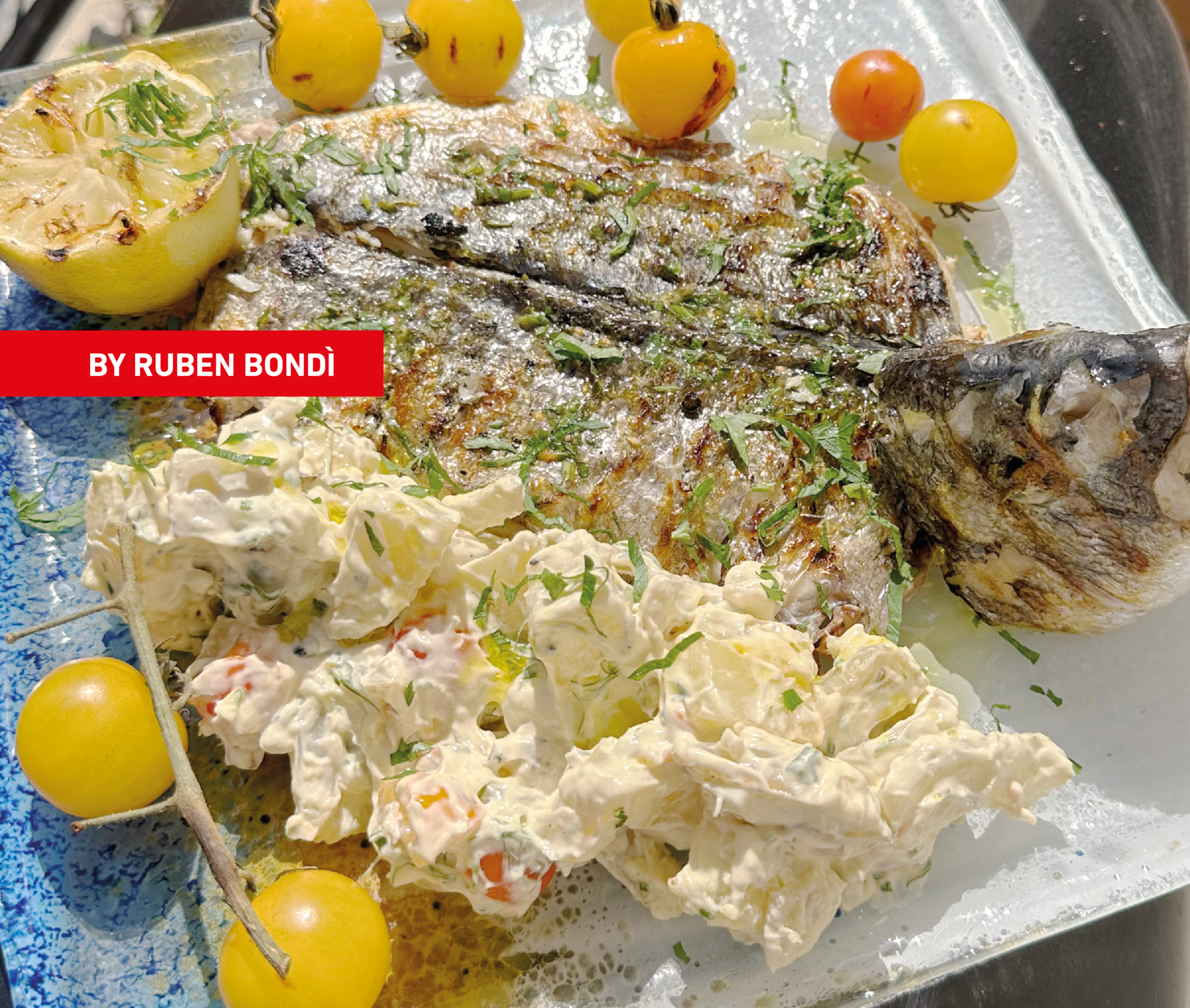 Servire il pesce con l’insalata di patate e mezzo limone grigliato.