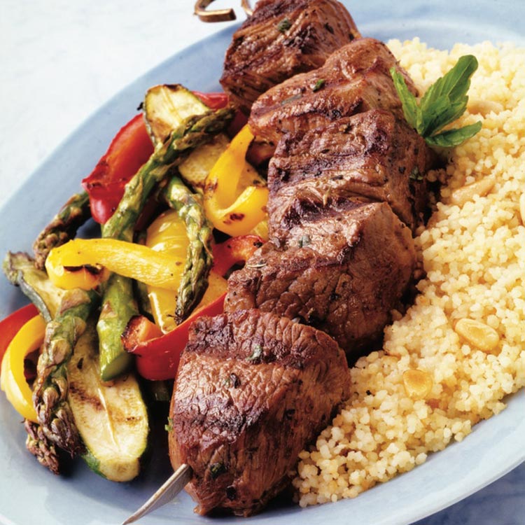 Spiedini di agnello alle erbe con couscous tostato e verdure