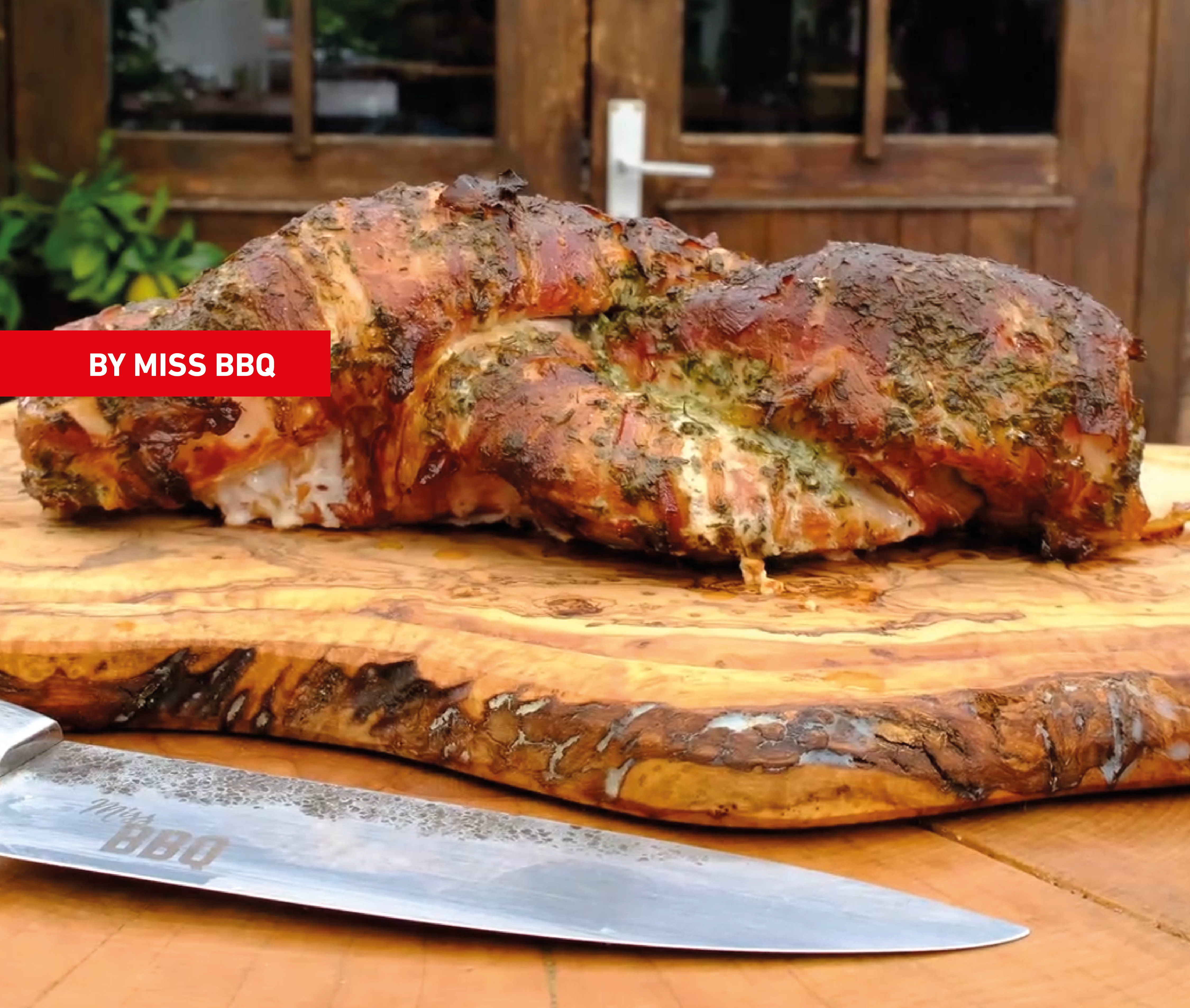 Accendere il barbecue a 170°, mettere la carne sulla griglia fino a raggiungere 60/62°C nella parte più spessa della treccia.
